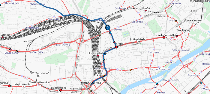 - Aufbau eines Graphen aus z.B. Schienen- oder Straßengeometrien und Einsortieren der Stationen aus dem GTFS-Feed