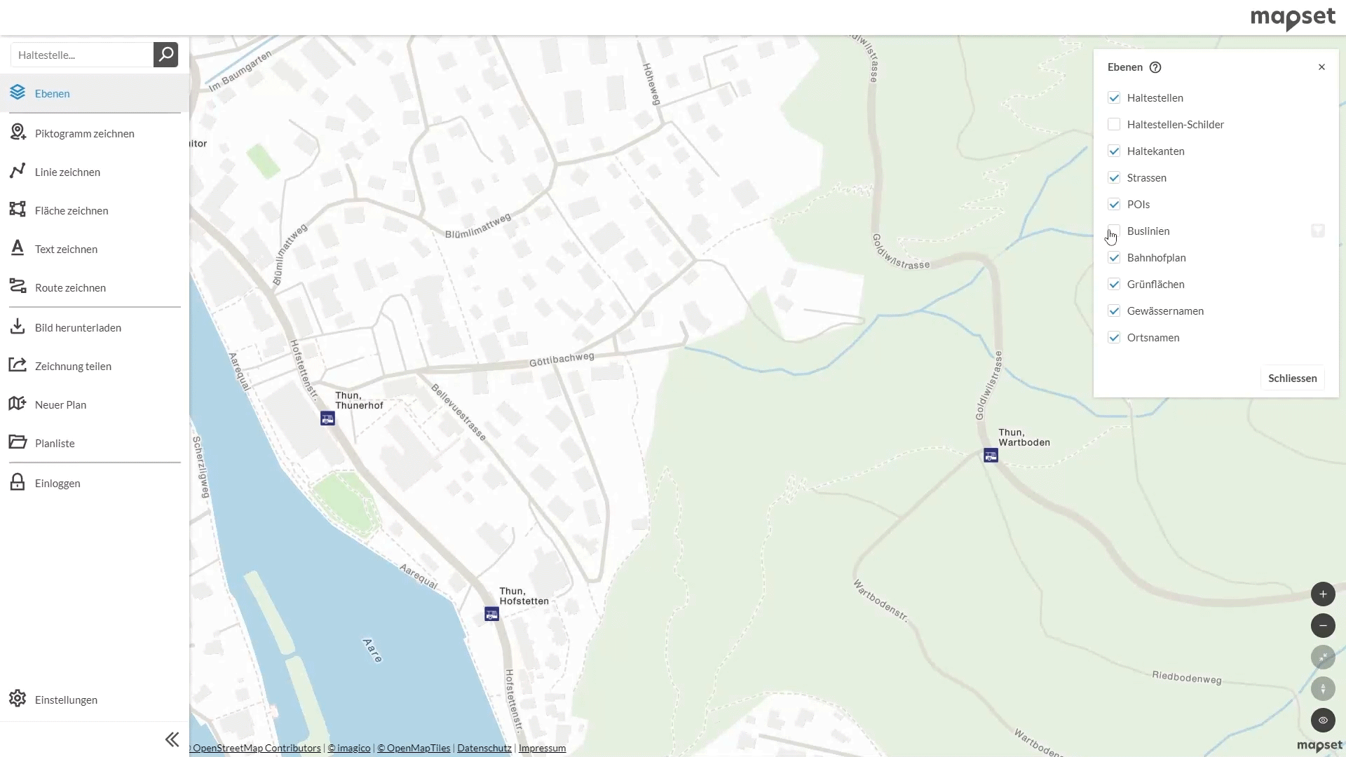 Falls Sie mapset noch nicht nutzen, probieren Sie am besten unsere Demo-Version unter mapset.ch aus. Mit ihr können Sie mapset und seine umfangreichen Funktionen unverbindlich testen. Auf der Homepage unter mapset.ch finden sie auch ein Video, das die einfache Bedienung von mapset und die Gestaltungsmöglichkeiten von Plänen zeigt.