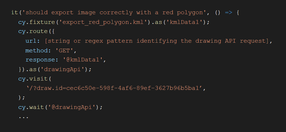 Next, in our test we need to visit() mapset and load a plan into the map. In interactive mode mapset launches a GET request to an API in the backend, fetching a KML file on success and loading it into the map. Obviously, we want to avoid this behaviour in the tests in order to make them backend-independent. Luckily Cypress allows us to stub request responses. This way we can define preset fixtures to be returned from requests to drawing API in every test.