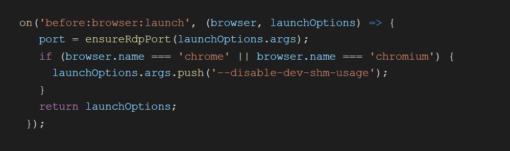 To our great dismay our pipeline still kept failing during the Cypress test stage, since our tests were causing the chrome instance to freeze. After some serious investigation and a lot of coffee, we did find the culprit: our pipelines run in Docker containers with a default shared memory space limit, which may be too small for handling large web contents in chrome. We solved this by adding --disable-dev-shm-usage to the chrome launch options to remove the bottleneck, as recommended by Google (check out the Google documentation).